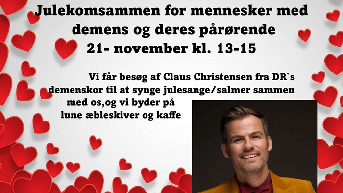 Vi får denne dag besøg af Claus Christensen fra DR`s demenskor til at komme og synge julesange/ salmer sammen med os. Vi mødes i kirkerummet kl. 13 og vil midtvejs holde en pause, hvor vi nyder lune æbleskiver og kaffe inden vi derefter fortsætter med sang i kirkerummet. Ingen kan synge og se sure ud og sang skaber glæde og gode minder, så tag derfor dine pårørende under armen og kom og vær med til en hyggelig eftermiddag i julens tegn i Skelgårdskirken.