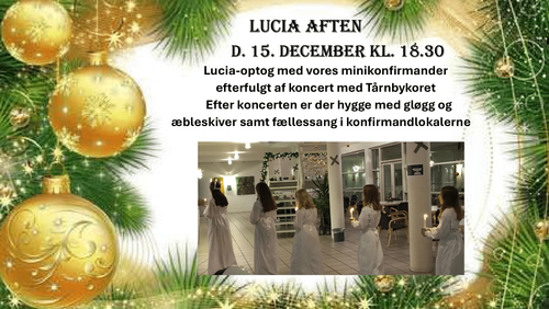 Der vil være Lucia-optog med kirkens mini-konfirmander efterfulgt af koncert med Tårnbykoret med deltagelse af mini-konfirmanderne.